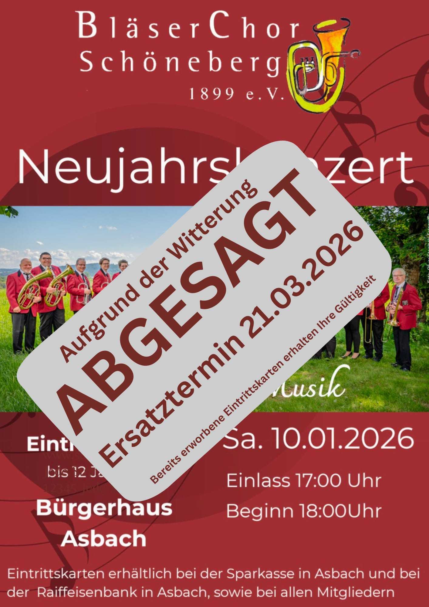 aufgrund der bestehenden Wetterwarnungen sowie im Interesse der Gesundheit und Sicherheit aller Mitwirkenden und Gäste sehen wir uns nach sorgfältiger Abwägung leider veranlasst, vorgesehene Neujahrskonzert auf